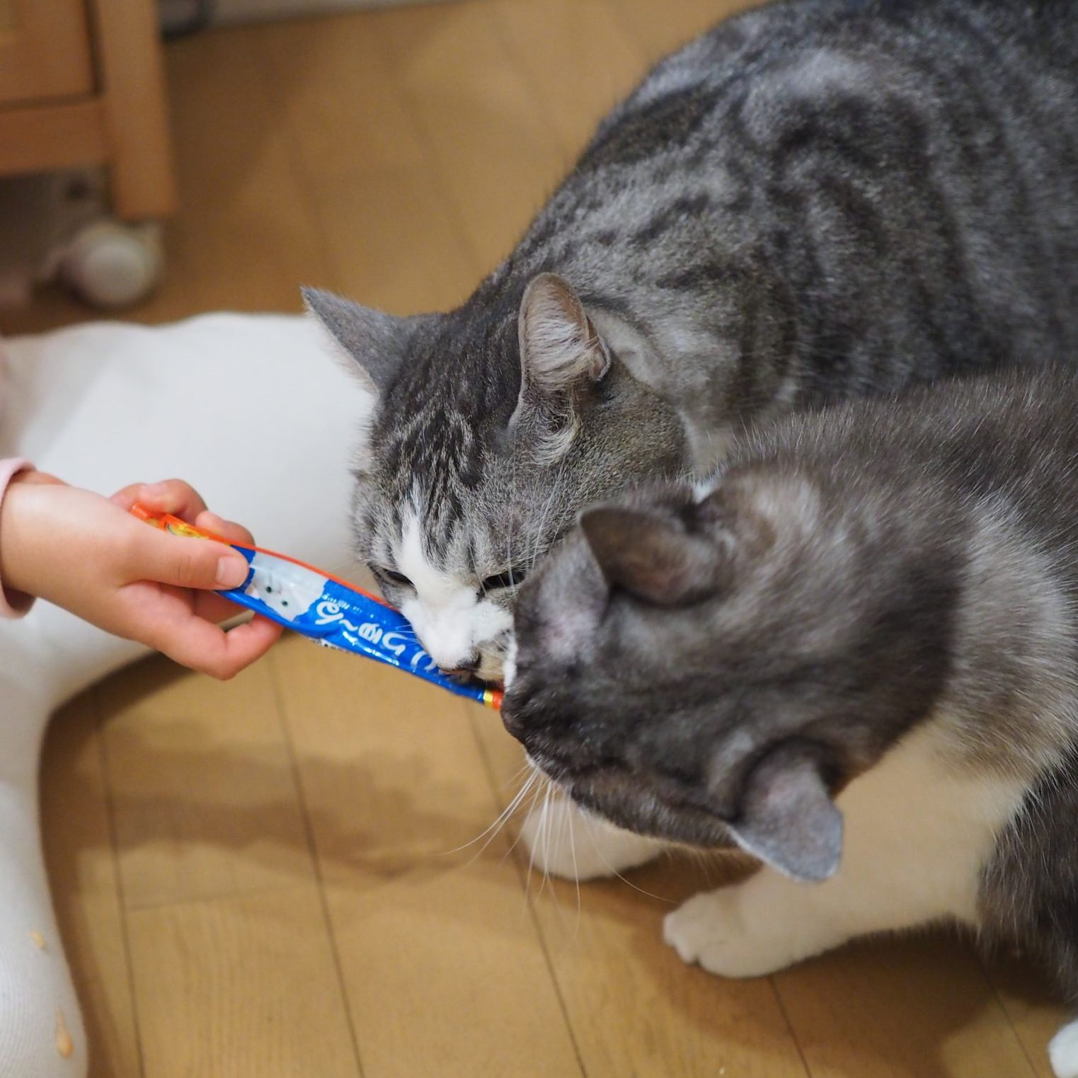 我が家もそうなのですが、ちゅ〜るをとり出した途端に「はよ、よこさんかい!!」と言わんばかりにニャンニャン鳴き、ものすごい勢いで平らげます。