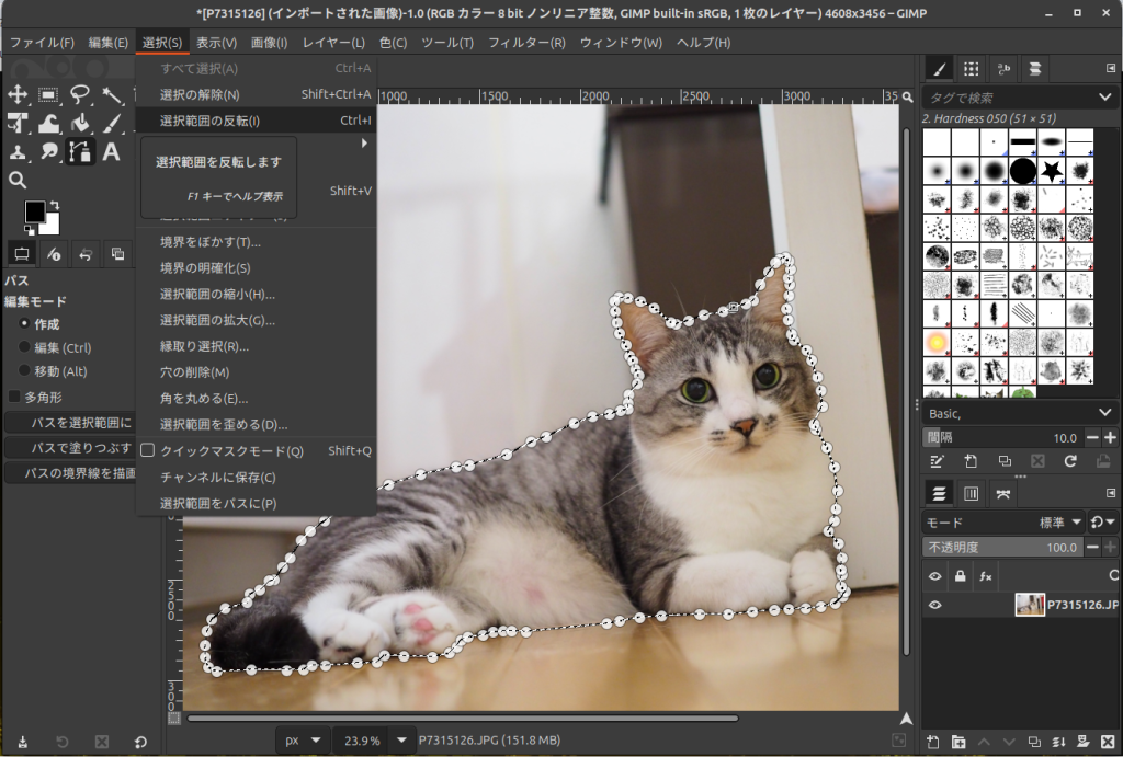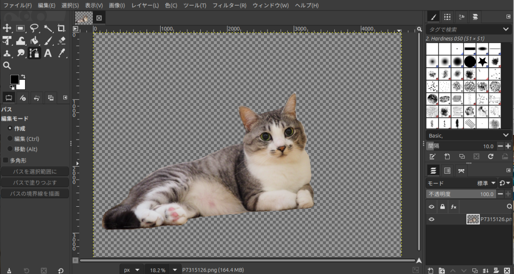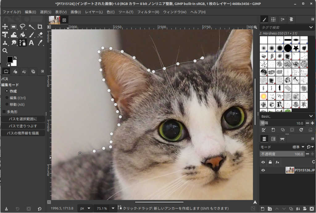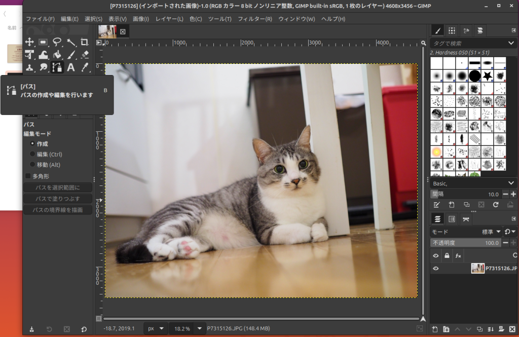 GIMPを起動し、切り抜きたい猫ちゃんの画像を開きます。