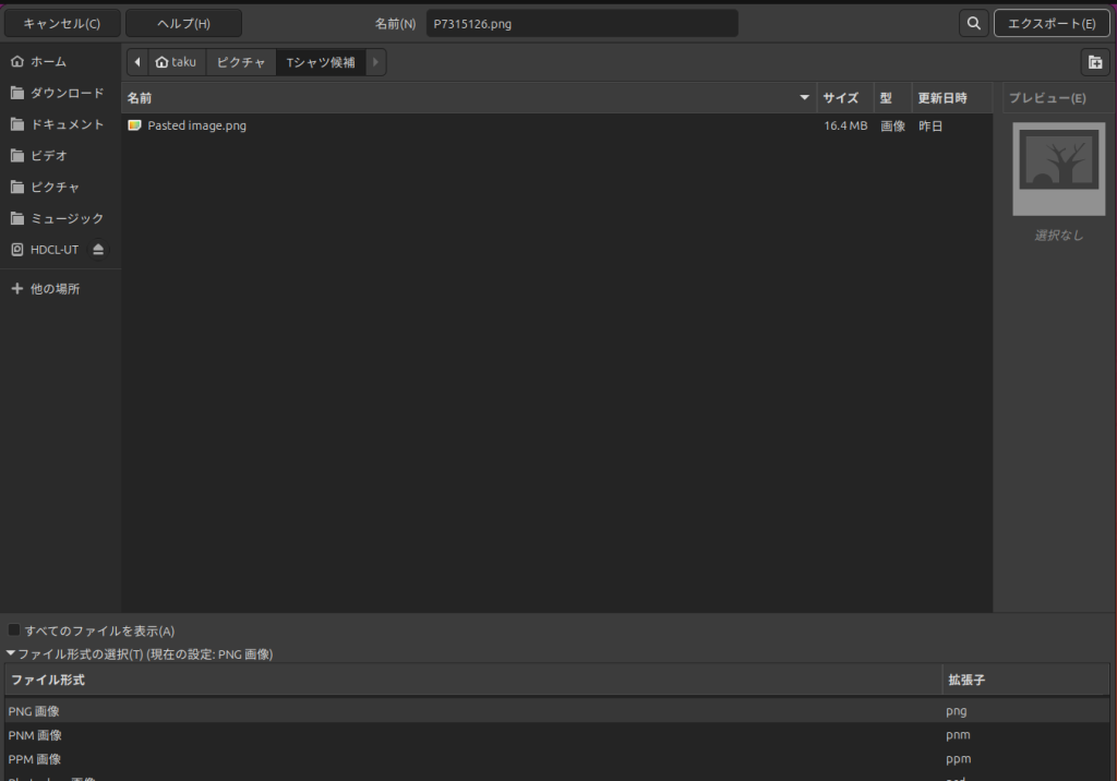 「ファイル」→「名前を付けてエクスポート」を選択し、PNG画像として保存しましょう。