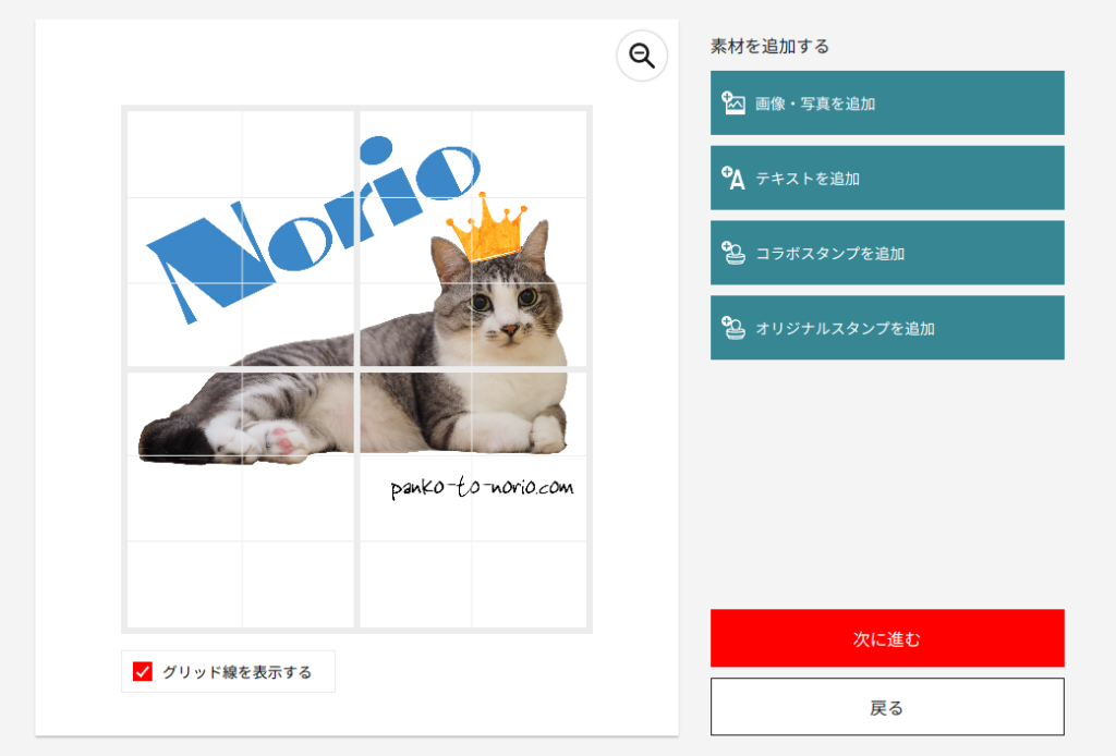 「次に進む」からデザインしたものを保存したり、カートに追加して注文することができます。