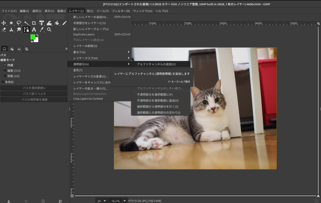 切り抜いた他の部分を透明化したいので、メニューの「レイヤー」→「透明部分」→「アルファチャンネルの追加」を選択します。