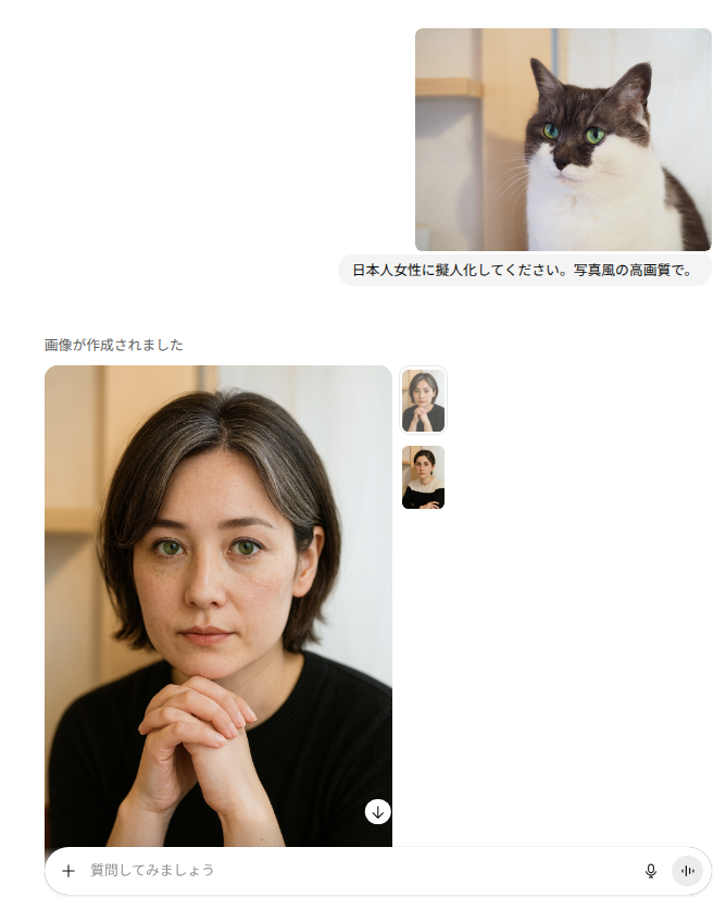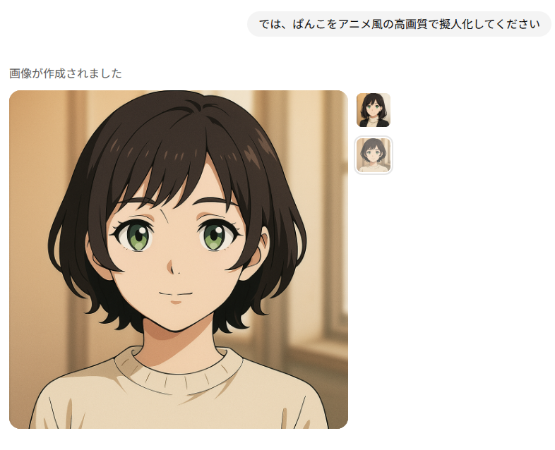 アップロードして、「擬人化画像作って」でも作ってもらうことはできますし、ChatGPT自身、どんな風にしますか、アニメ風?写真風?と聞き返してくれることもあります。