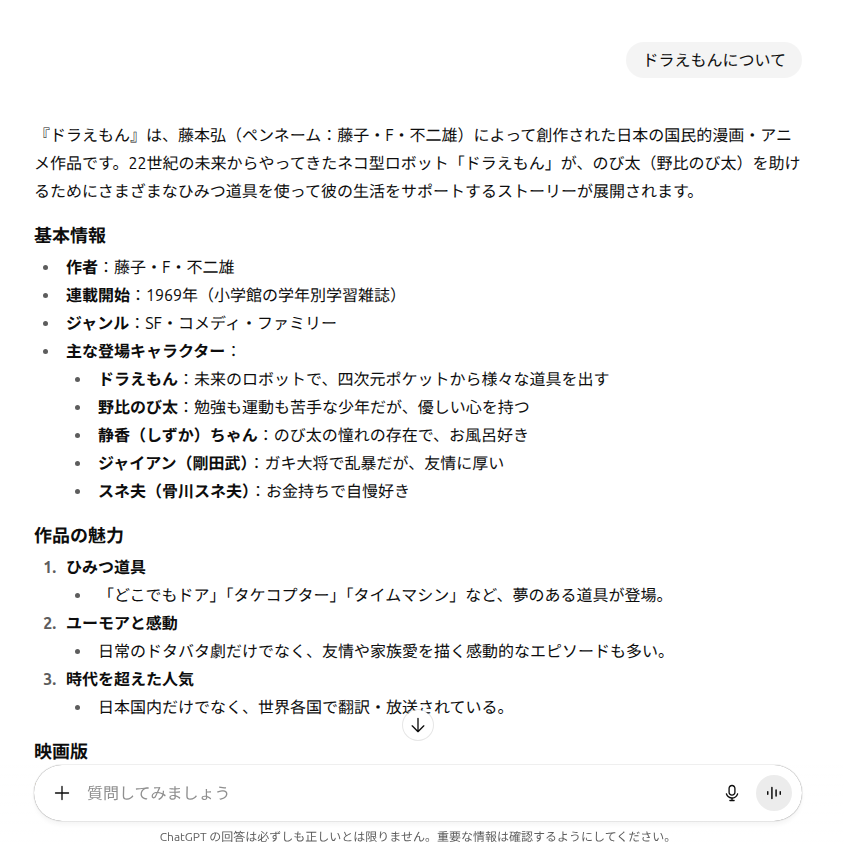 Googleのような検索エンジンで調べてみる感じで投げかけてみると、バーっと調べてきてくれたことを紹介してくれます。