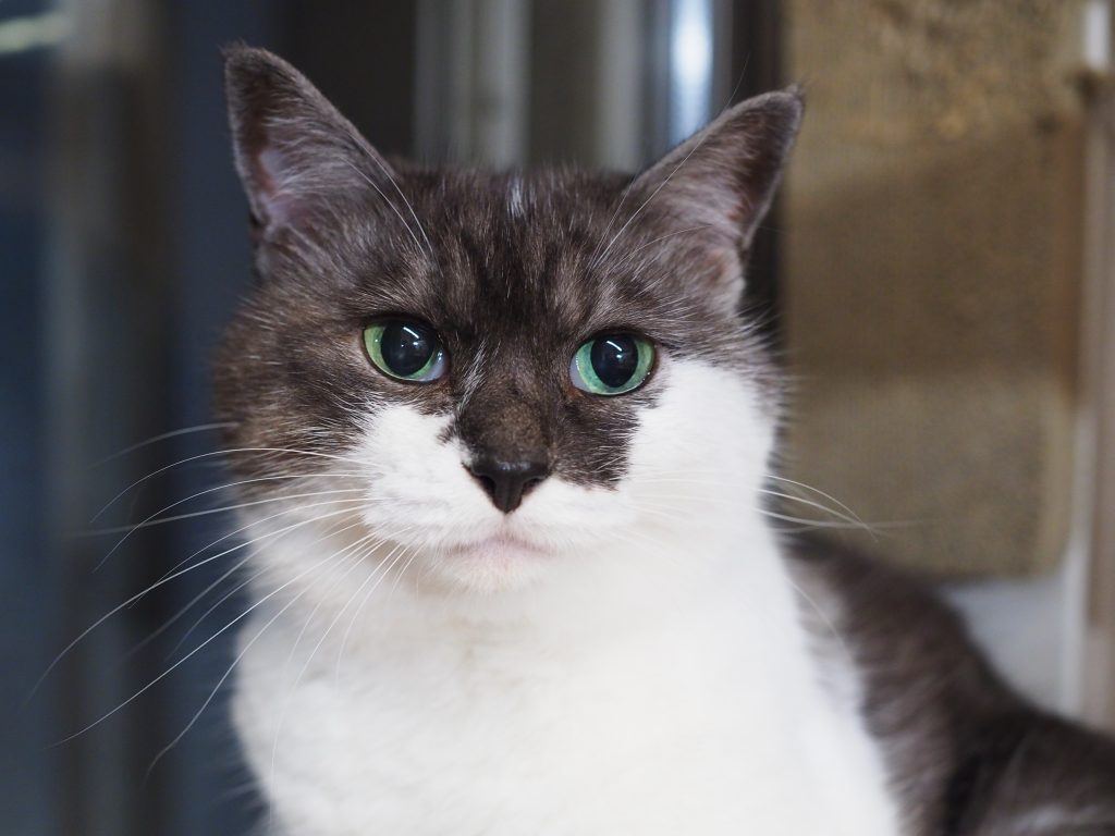 白黒のマスク猫で黒部分はブラックスモークと言われる根元が白いタイプ。